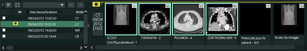 Le Sélecteur de séries peut contenir des miniatures de série des examens en cours et antérieurs. Ces miniatures sont des représentations JPG des images DICOM.